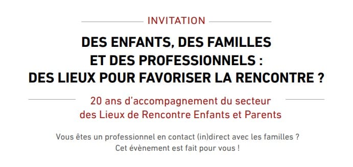 La Cellule « Soutien à la Parentalité » et le « Service Coordination et Appui en matière de Prévention et de Protection de l'enfant (CAPP) » de l'ONE ont le plaisir de inviter tout professionnel en contact direct ou direct avec les familles au colloque célébrant les 20 ans d'accompagnement du secteur des Lieux de Rencontre Enfants et Parents. Quand […]