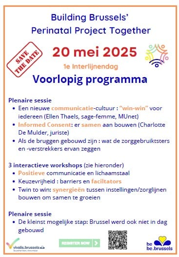 Deze Interlijnendag wil bruggen bouwen naar een nieuwe perinatale cultuur in Brussel, gebaseerd op complementariteit, collectieve intelligentie en de ‘biodiversiteit’ van benaderingen, instellingen en mensen. “We hopen jullie talrijk, gynaecologen, huisartsen, kinderartsen en vroedvrouwen, zowel van de eerste als van de tweede lijn, (terug) te zien op 20.05.2025 voor een gratis dag met interactieve workshops in kleine groepen.”